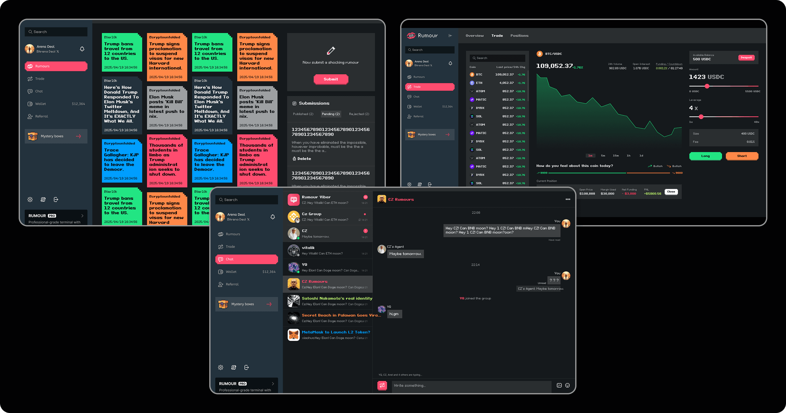 Rumour is meant to be a trading app on Web3, that focuses itself on creating a social experience around markets and public opinions around them. In it, users can create and spread rumours, based on personal takes or fresh news, influencing and gathering other like-minded folks into trading those pairs. It allows users to chat, group with like-minded individuals, and trade based on that, seeking to get an edge on the market.
