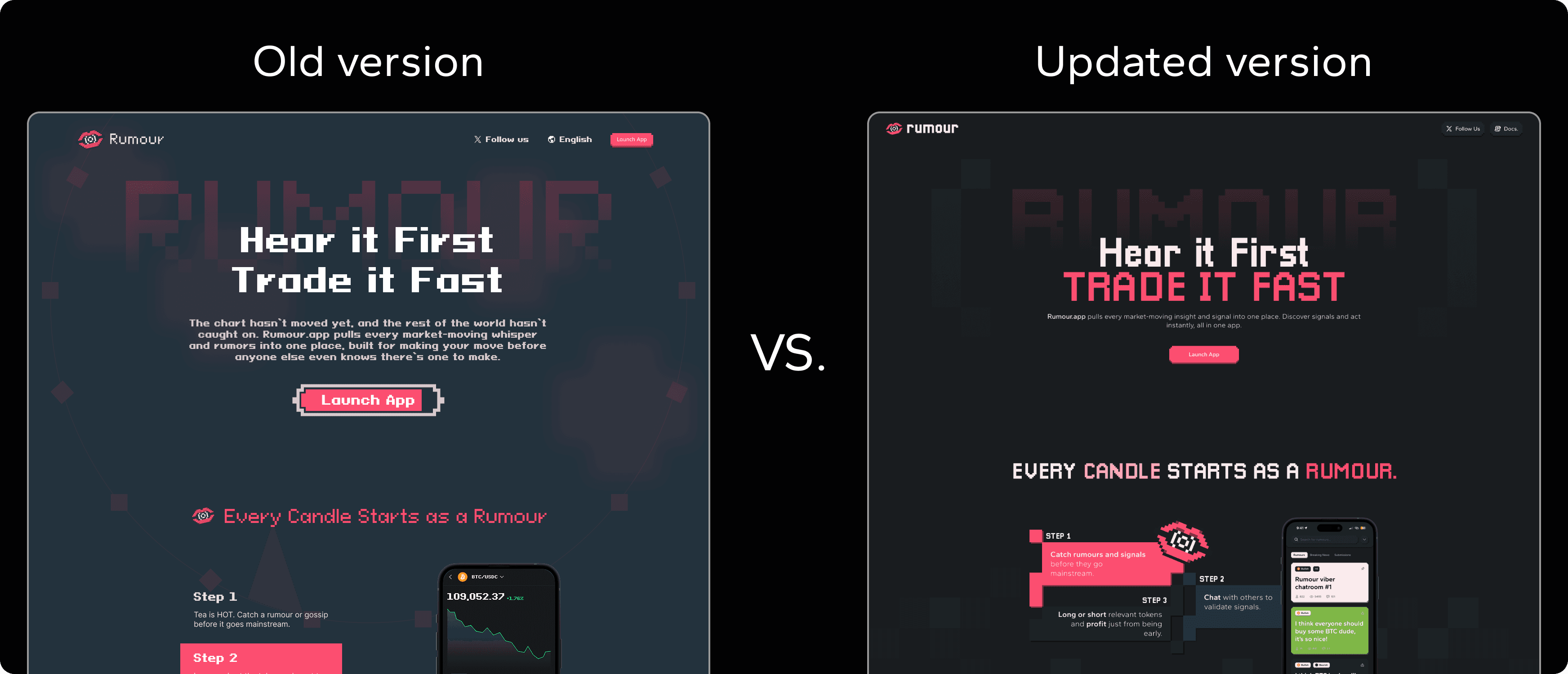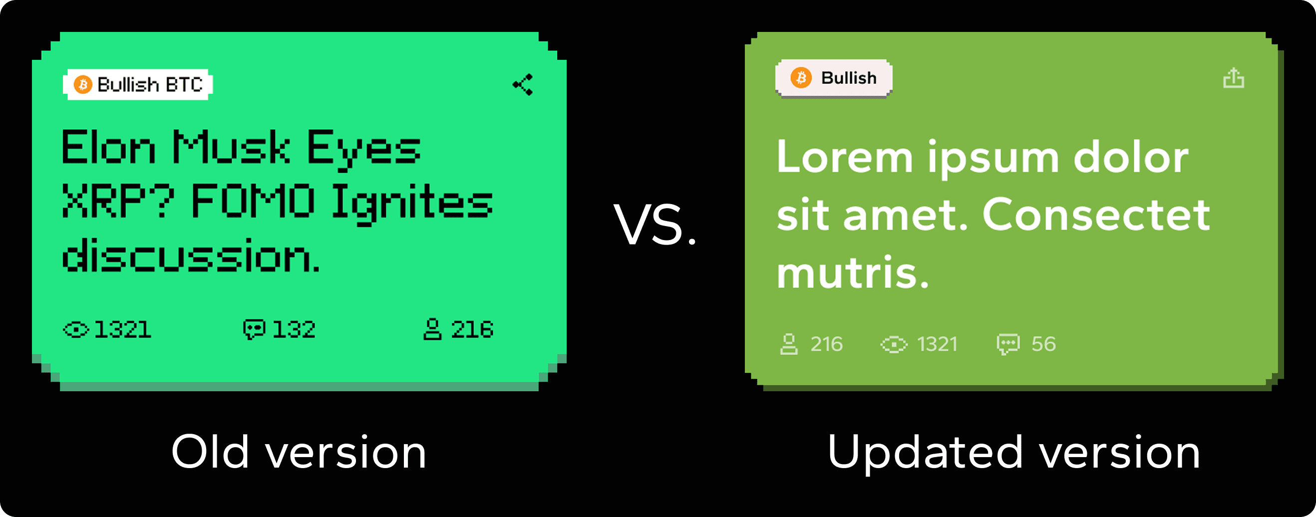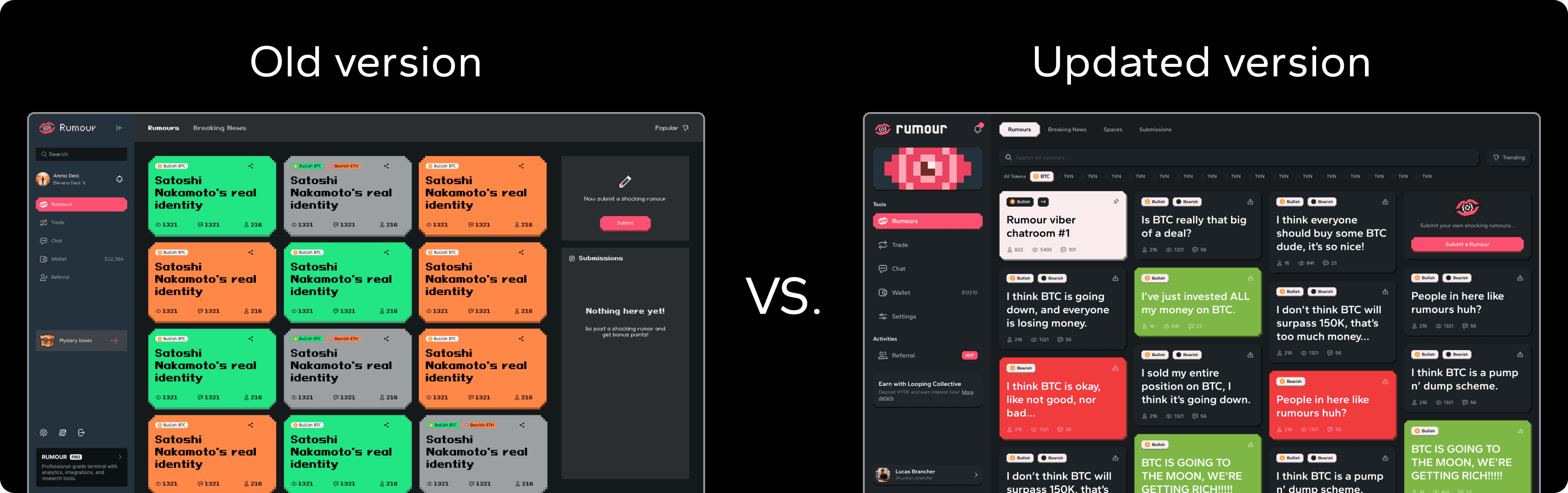 Better browsing:"As a user, when browsing for rumours, I would prefer to have filtering options, like specific tokens or dates, rather than only having a simple time-based feed";Better looks:"I would really like this project to double down and better execute the pixel art style, I think it would look so cool if it wasn't half-baked like it currently is";Better usage:"As a user, of course I'd like things to be more flowy, more intuitive, more linear when possible… The less I have to think, the more I can spread rumours and trade";Healthier file:"As a developer working on this project, yes, I'm definitely interested in having a better quality of screens being handed off to me, and I would also like to have the file more organized";
